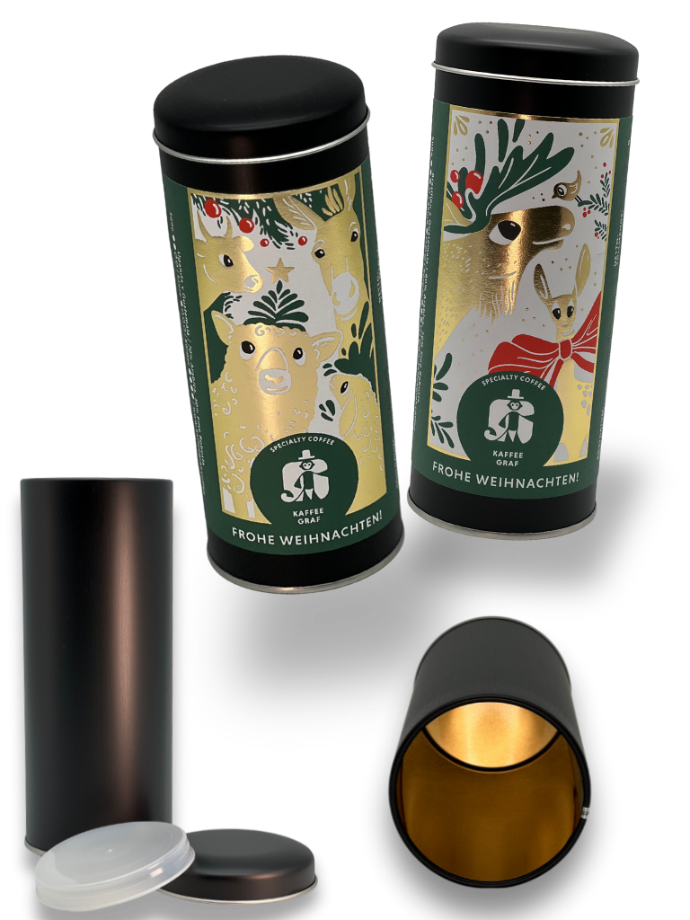 Bei Kaffeegraf setzen wir auf höchste Qualität – in allen Bereichen. Für unsere Weihnachtsedition verwenden wir besonders hochwertige, lebensmittelechte 250-g-Metalldosen, die Du auf den Bildern links siehst. Robust, aromasicher und zuhause unendlich oft wiederverwendbar – als Kaffee-, Tee-, Gewürz- oder Keksdose.